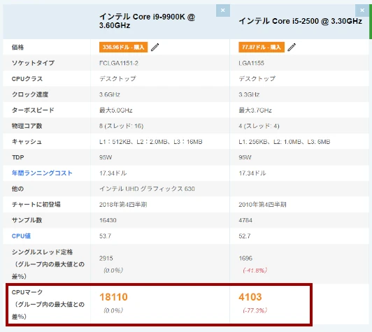 低い性能の方に(-x%)と表示されていると思いますが、これがその性能差の割合です。それくらい性能差があるということですね。