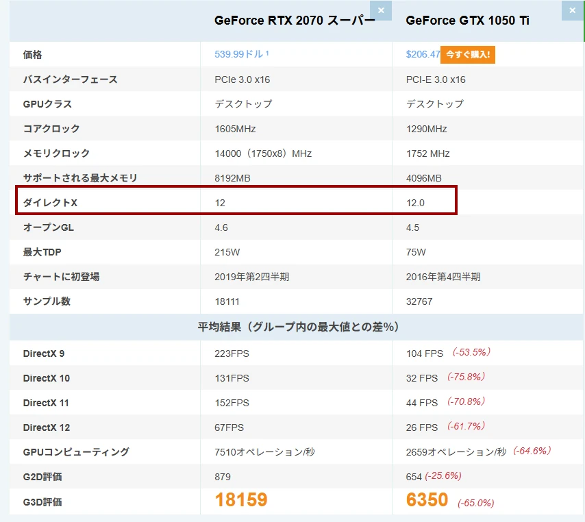 表の上から7番目にあるのがDirectX。DirectXとはGPUでグラフィックを表現するためのバージョン規格のようなものです。このバージョンがあがるごとにグラフィックがきれいになっていくものと考えて良いでしょう。