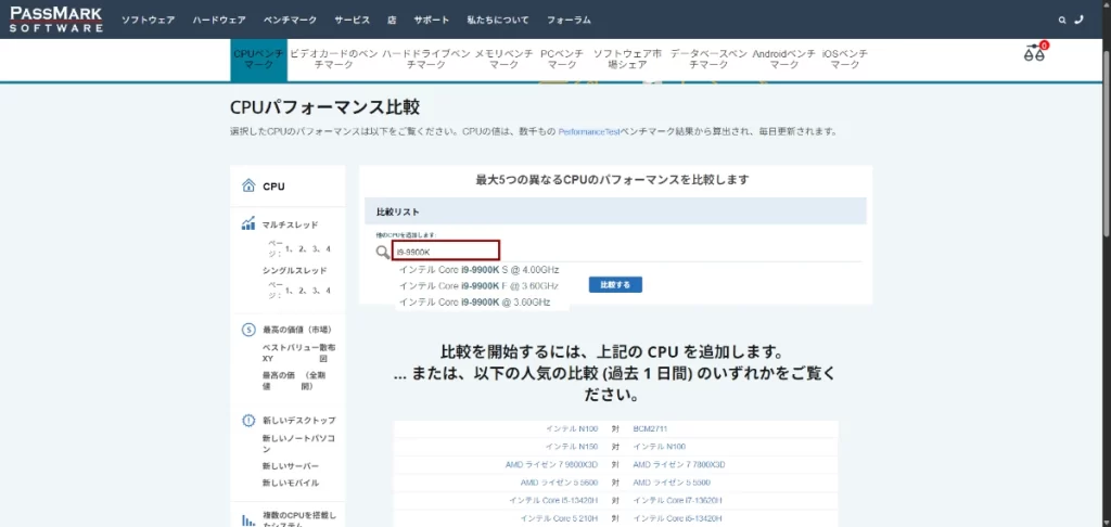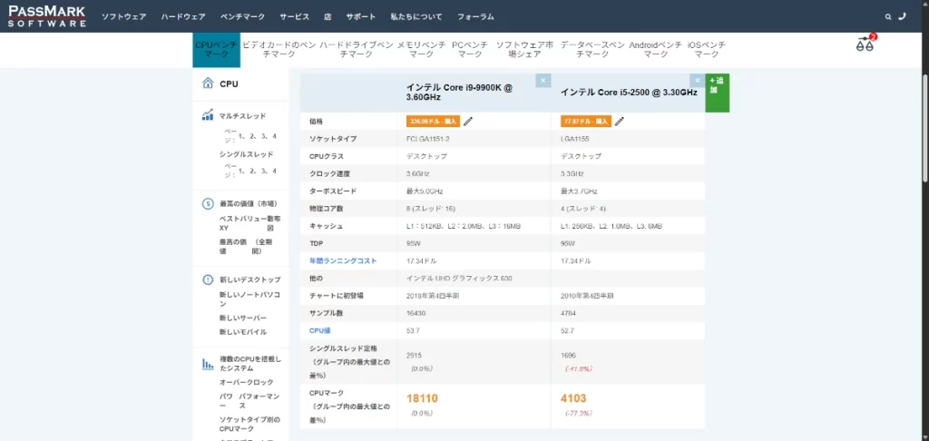 つまり今回の手順通りに並べていると左側に欲しいゲーミングPCのCPU、右側に欲しいゲームの最低スペックCPUが表示されているはずです。左側の欲しいPCのCPUのスコアの数字が上回っていればスペック的に上であるということですね。