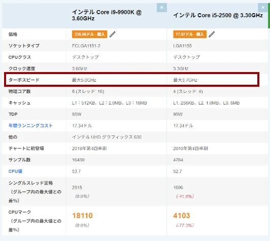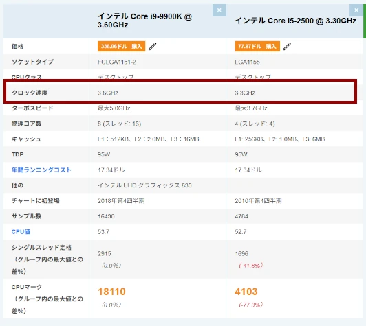まずはCPU比較結果の上から4つ目にあるCPUのクロック速度という項目です。ここを見ることでそのパーツの周波数がわかります。数字が大きいほど性能は高くなります。どれくらいがベストな性能なのかですが。